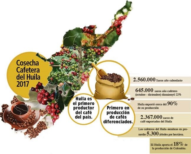 Huila cuenta con aproximadamente 154.000 hectáreas cultivadas en unos 101.000 parcelas y 83.000 cafeteros en el departamento que en promedio equivalen a 1.7 hectáreas por caficultor, es decir un cultivo del café claramente minifundista.